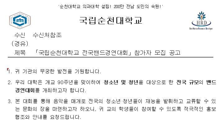 「국립순천대학교 전국밴드경연대회」참가자 모집 안내