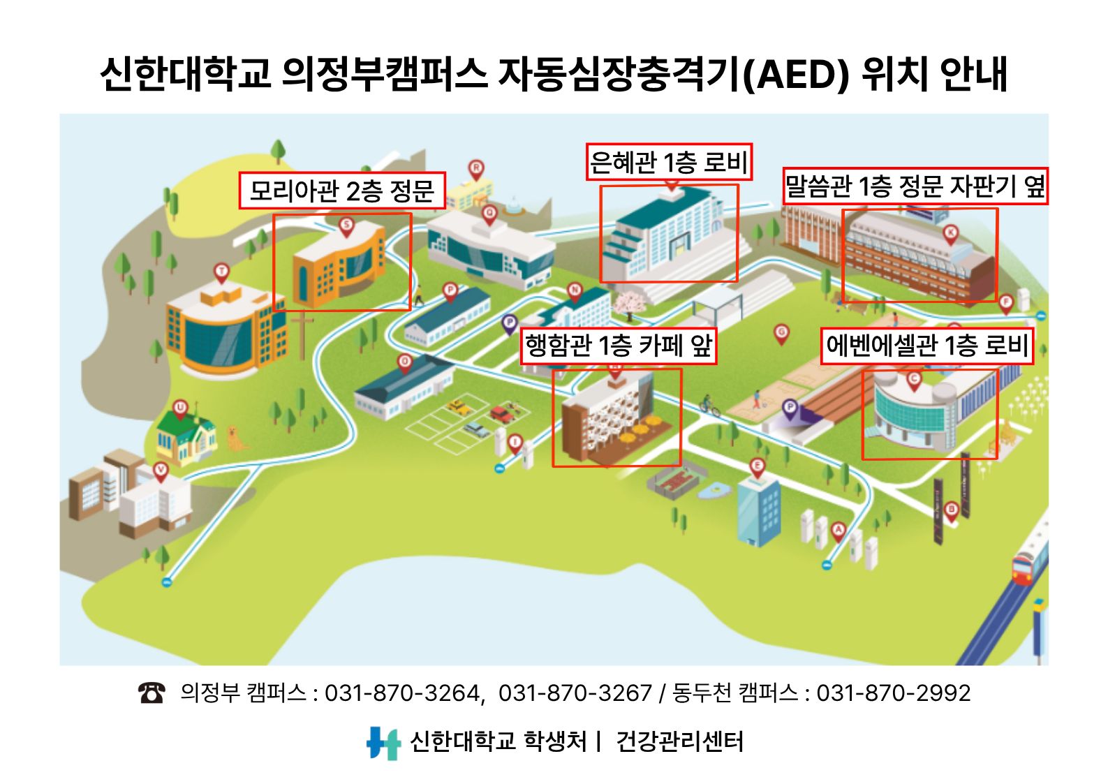 1. 학생처 건강관리센터에서는 교내 응급상황에 대비하여 자동심장충격기(AED)를 설치·운영하고 있습니다.